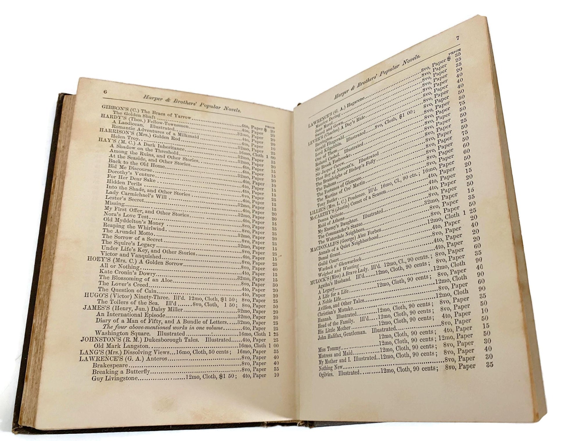 An antique book, Ben-Hur A Tale of the Christ. The first edition book was published by Harper & Brothers, Franklin Square, NY; 1880. The hardcover book has 552 pages with 12 pages of advertisements. In very good antique condition, the brown cloth covers have beveled edges with edge and corner wear; spine has edge wear-title still clear. Interior pages have foxing. A good first edition copy from the 19th century.