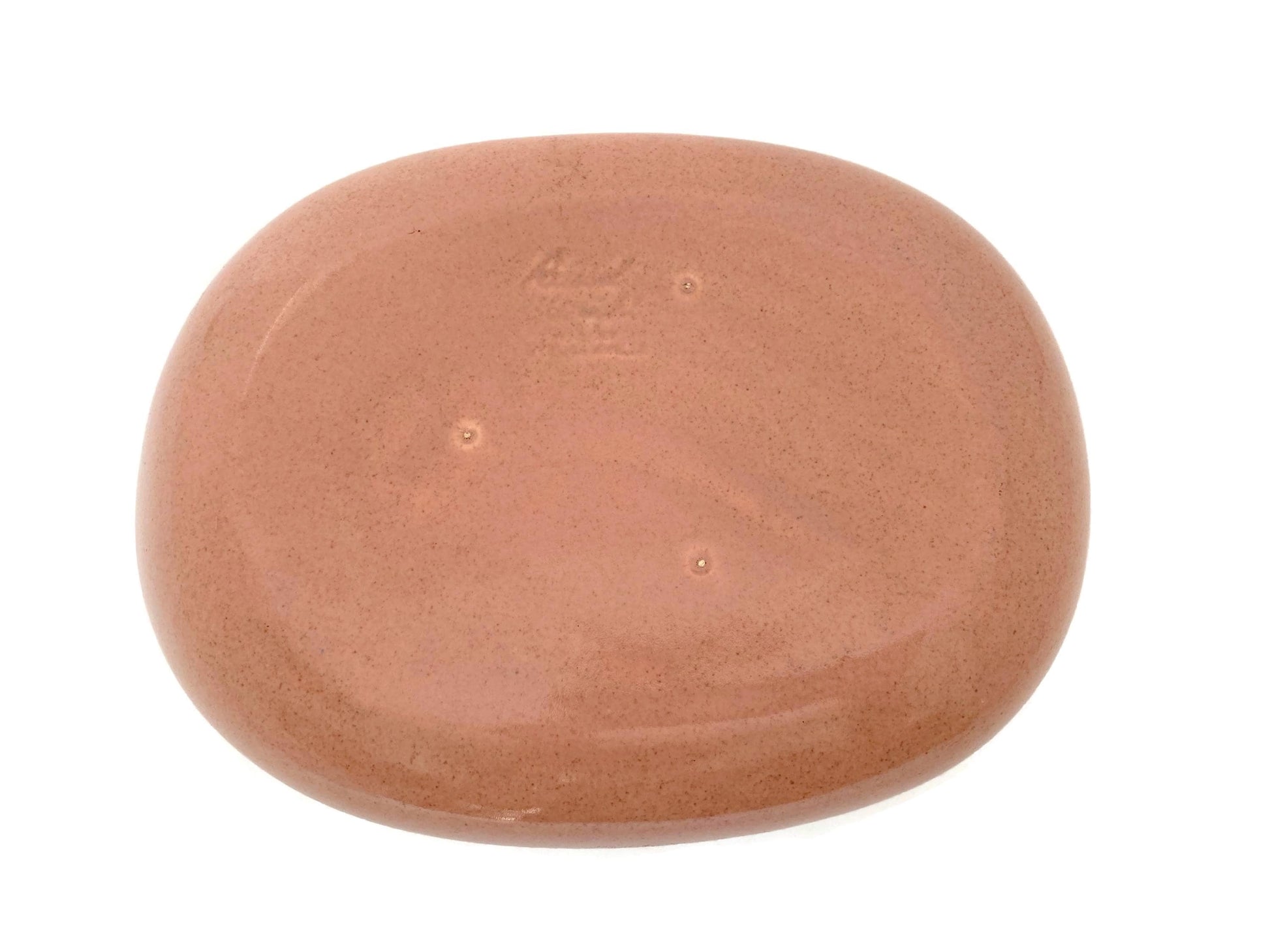 A lovely mid century modern Russel Wright Steubenville American Modern oval dish. In the color Coral, this modern design is circa 1939 - 1959. The oval serving dish is signed on bottom, measuring approximately 10" long x 7" wide. The dish is in very good vintage condition, with surface scratching and crazing, no chips or cracks and remains very glossy.