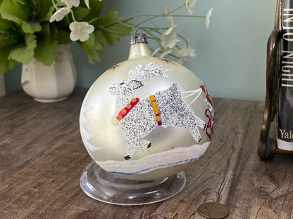 A rare, hand painted midcentury Fantasia Christmas glass ornament; made in Poland. The hand painted Santa on his sleigh with a sparkly reindeer also features atomic stars. The glass ornament is in good vintage condition with no chips or cracks; finish issues include wear and discoloration. The relatively large ornament measures approximately 3 3/4" in diameter.