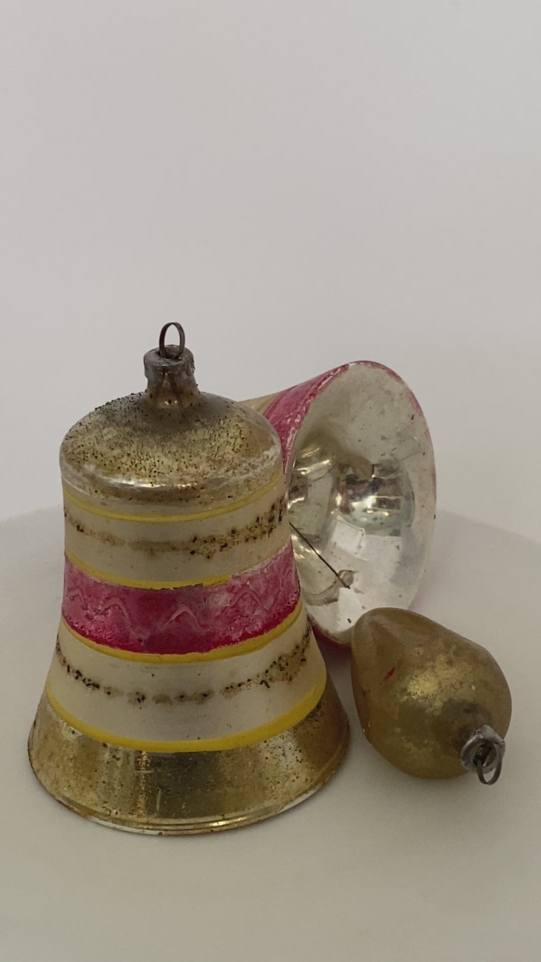 A wonderful assortment of 3 vintage Glass Christmas Ornaments. Three ornaments included two bells, and one elongated ornament. The Bells measure approximately 3 1/4" long, smaller ornament is approximately 3" long. In vintage condition with finish loss/wear; please review photos.