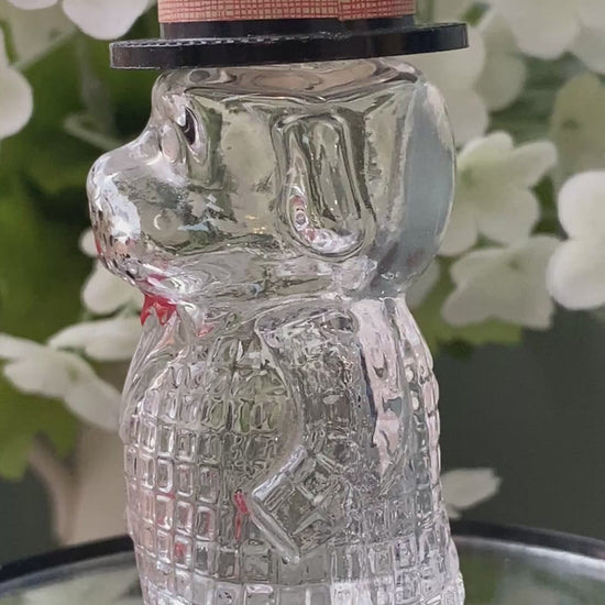 A cute, vintage dog figural glass cologne bottle. The 1930s bulldog looks so dapper, holding an umbrella. His hat is a screw on plastic cap. The empty bottle originally held fragrance, you can still smell the aroma when you open the bottle; adorable pup collectible. The dog measures approximately 2 3/4" tall and is in very good vintage condition-no chips or cracks.